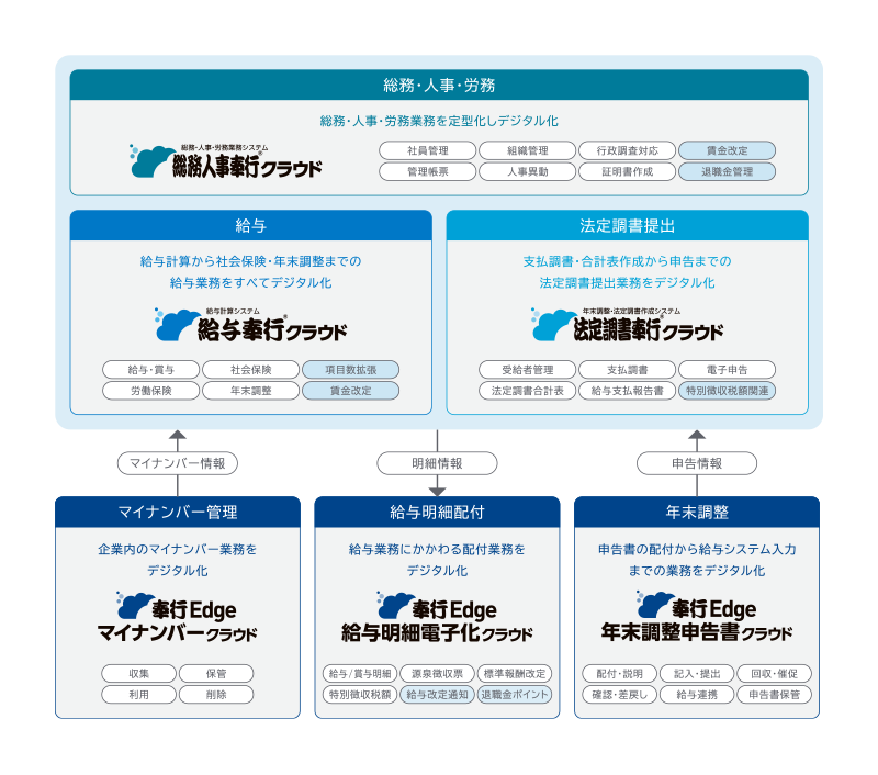 総務人事奉行クラウド、給与奉行クラウド、法定調書奉行クラウド、奉行Edgeマイナンバークラウド、奉行Edge給与明細電子化クラウド、