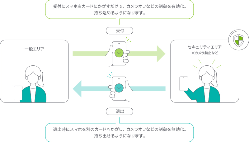 セキュリティエリアでは、MDMの制御(スマートフォンのカメラなどが利用できなくなるなど)が行えるなどのシステムが欲しい。
